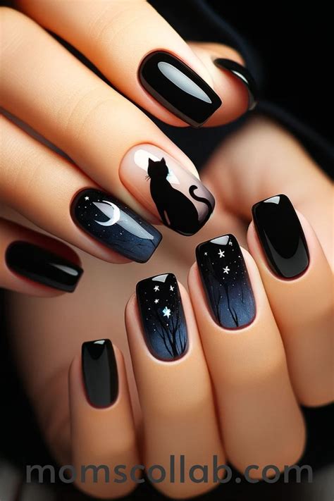 Embrace the mysterious allure of sleek black cats with nails adorned in their silhouette. Leave a sophisticated impression with matte black polish and use a fine brush to paint the outline of a cat’s head, complete with pointy ears and a piercing gaze. For an added touch of elegance, accentuate the design with a tiny rhinestone collar.