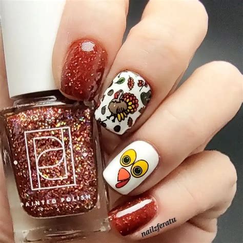 Indulge in the flavors of autumn with this adorable PSL turkey design. Paint your nails with a neutral base coat. Using thin brushes, draw small brown ovals for the turkey’s body and orange triangles for the beak and wattle. Add a touch of white for the eyes and a sprinkle of nutmeg on the turkey’s head. Perfection!